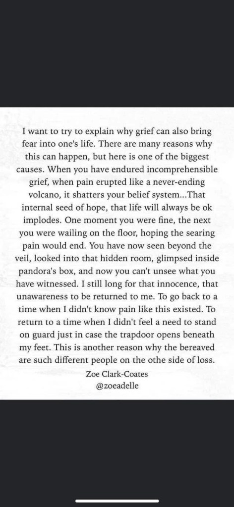 With that fear comes this thought that never seems to really go away, this acceptance of lifes disappointments. Things happen, and people say or do things that make you feel a certain way. In comes the thought of ”I knew this would happen because why wouldn’t it? my world got flipped upside down so it makes sense this would happen. It makes sense they would say this or do that because this is life now.” So it’s a constant state of being afraid of the next grenade going off while also being quick to accept and expect the next thing to go wrong. Grief is complicated and no matter how much we write about it or speak on it I don’t think we will ever fully understand it. I am convinced fear is one of the feelings that sticks around the longest when grief enters your life.